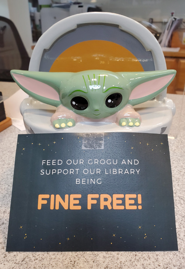 So if you have any library books laying around your house that you haven’t returned because you didn’t want to deal with late fines, bring them back and your full borrowing privileges will be restored! Our hope in going fine-free is that patrons who have not been to the library in a while will come back and start using our services again. And for those who didn’t mind supporting the library with your spare change after keeping your books a little late, feel free to donate to our new piggy bank at the front desk – just look for Grogu (Baby Yoda)!