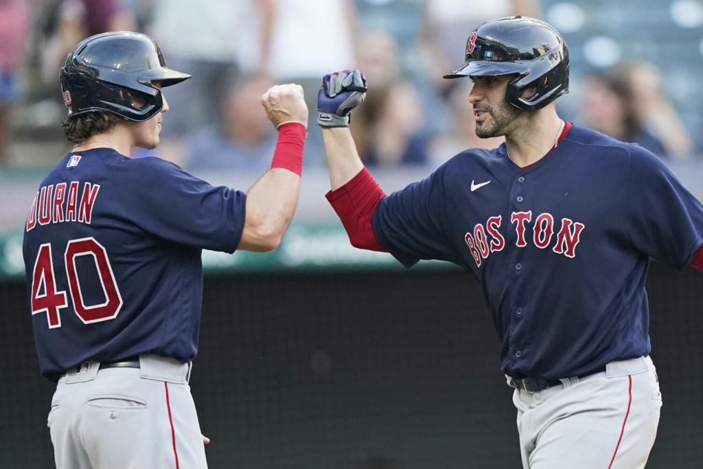 J.D. Martinez, right, is congratulated by Jarren Duran after hitting a three-run homer in the 10th inning Saturday against the Cleveland Indians. Tony Dejak/Associated Press