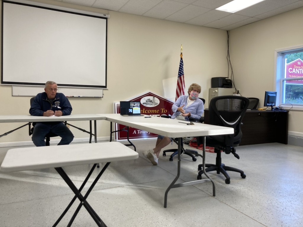 Canton Selectman Scotty Kilbreth and Planning Board Secretary Diane Ray answer questions Tuesday during a public hearing on allowing marijuana businesses and approving an ordinance to govern them. Also at the hearing at the Town Office were Selectmen Carole Robbins and Kristi Carrier. Marianne Hutchinson/Rumford Falls Times