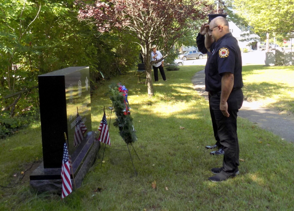 Nixon Ortiz from the Livermore Falls Police Department and behind him Jonathan Beaudette representing the Jay Police Department salute after placing a wreath at the First Responders Memorial in Union Park Saturday morning, Sept. 11. First responders from Jay, Livermore and Livermore Falls participated to remember the 20th anniversary of the 9/11 attacks on America. Pam Harnden/Livermore Falls Advertiser