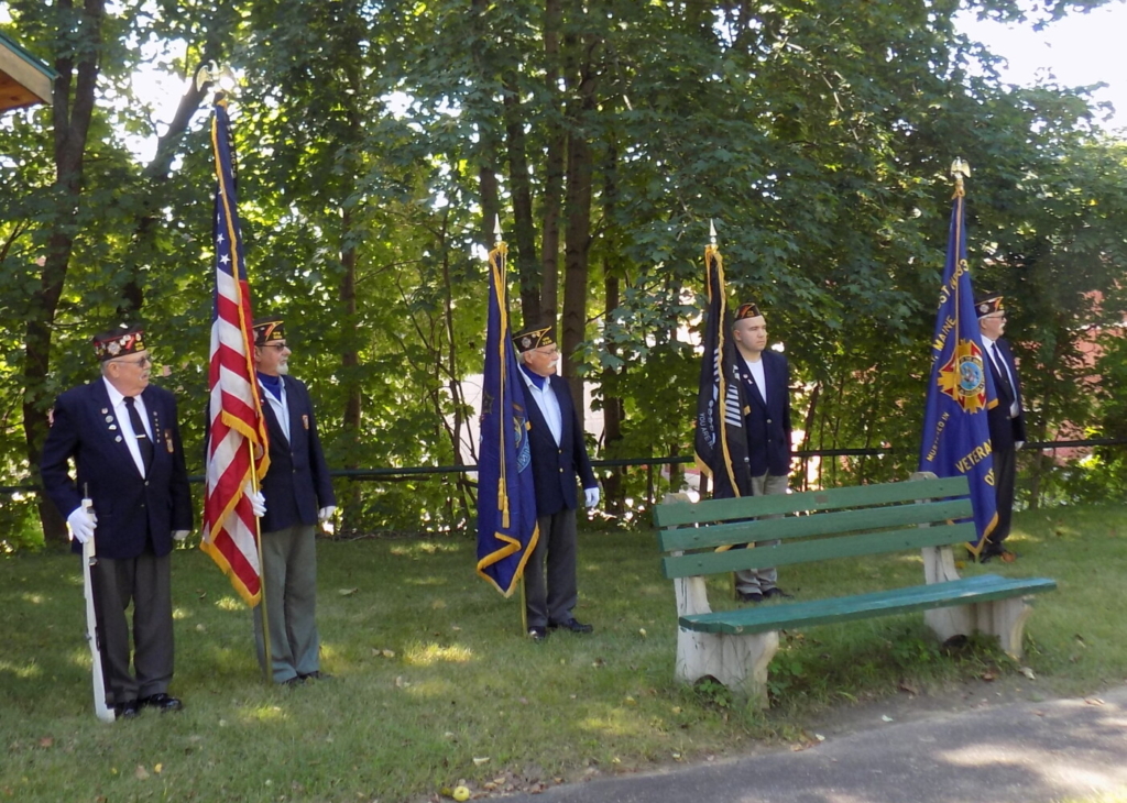 The color guard from VFW Post 3335 in Jay participates in the 9/11 remembrance ceremony held in Livermore Falls Saturday morning, Sept. 11. Seen from left are John Dube, Don Frechette, Larry Bilodeau, Clyde Pingree and Dave Lachapelle. Pam Harnden/Livermore Falls Advertiser