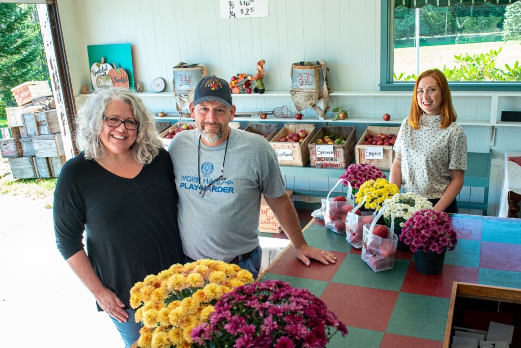 Jennifer Dolloff Barker, left, husband Jeff Barker and daughter Holly Lavorgna inside the store owned by her son, Sabin Lavorgna, on Sunday at Honey Hill Orchard on Ferry Road in Lewiston at the former Benoit’s Orchard. Russ Dillingham/Sun Journal