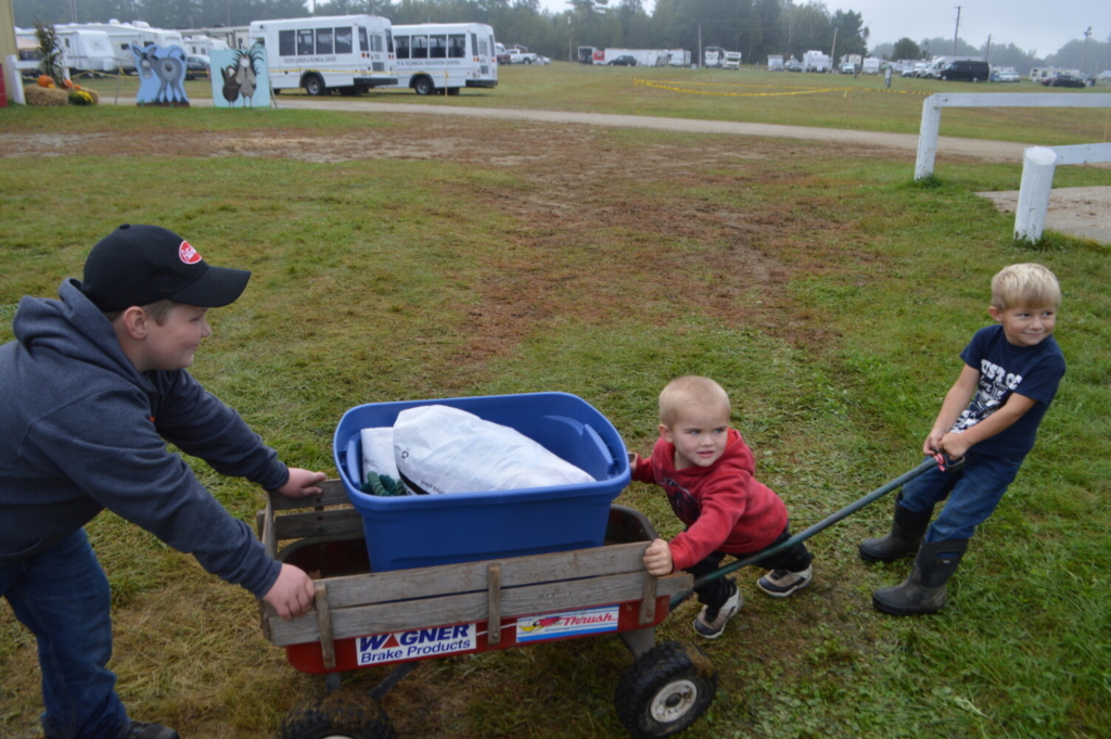 Bion Sillanppa, 9, pushes a wagon Tuesday as Sean Webber, 4, pulls it and Jacob Ouellette, 4, leans in the opposite direction at the Farmington Fair. All three are from New Vineyard. Donna M. Perry/Sun Journal