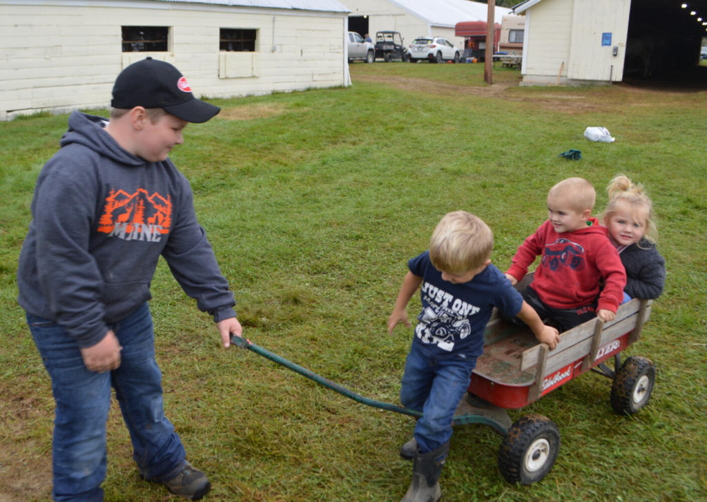 Bion Sillanppa, 9, of New Vineyard gives a ride Tuesday to other New Vineyard children at the Farmington Fair. With the wagon, from left, are Sean Webber, 4, Jacob Ouellette, 4, and his sister, Kellee Ouellette, 2. Donna M. Perry/Sun Journal