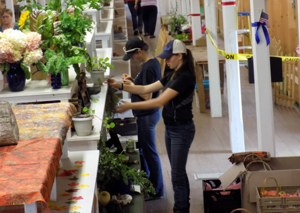 Riley and Holly Tardif of Hartford work on their Fiddlehead Farm youth farm products display in the Exhibition Hall Friday afternoon, Sept. 17. Cooper Tardif, not seen, also helped raise and arrange the display that can be seen this week during Farmington Fair. Pam Harnden/Livermore Falls Advertiser