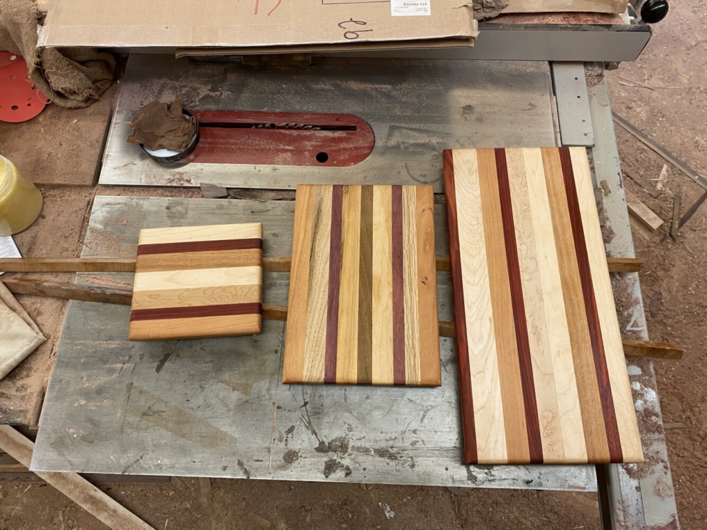 Three finished cutting boards made by Kay Neufeld, with ample assistance from woodworker John Nichols and apprentice Emma Schurink. Kay Neufeld/Franklin Journal