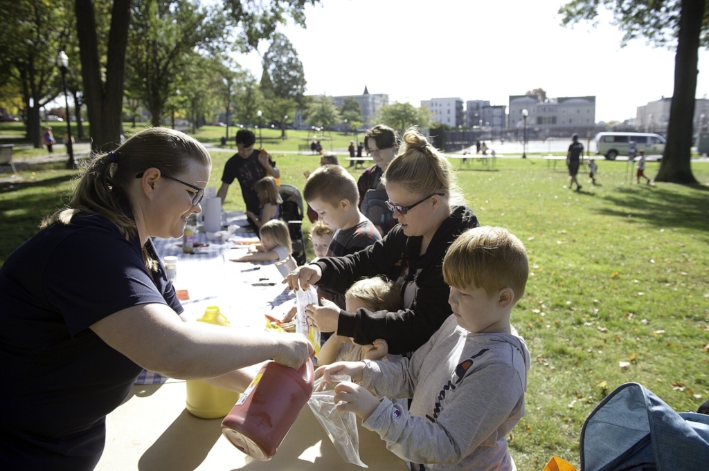 Sara Turner, children’s librarian at Lewiston Public Library, pours red paint Friday for children making pumpkin sensory bags during Pumpkins in the Park in Lewiston. Lewiston Recreation and the Lewiston Public Library hosted the free event in Kennedy Park. Children could make crafts, play games and decorate pumpkins donated by local orchards, Recreation Director Nicole Welch said. The University of Southern Maine theater production, “The Marvelous Meep Island Adventure,” will be held in the park Saturday at 11 a.m. and in Auburn’s Festival Plaza at 3:30 p.m. Admission is free. Daryn Slover/Sun Journal