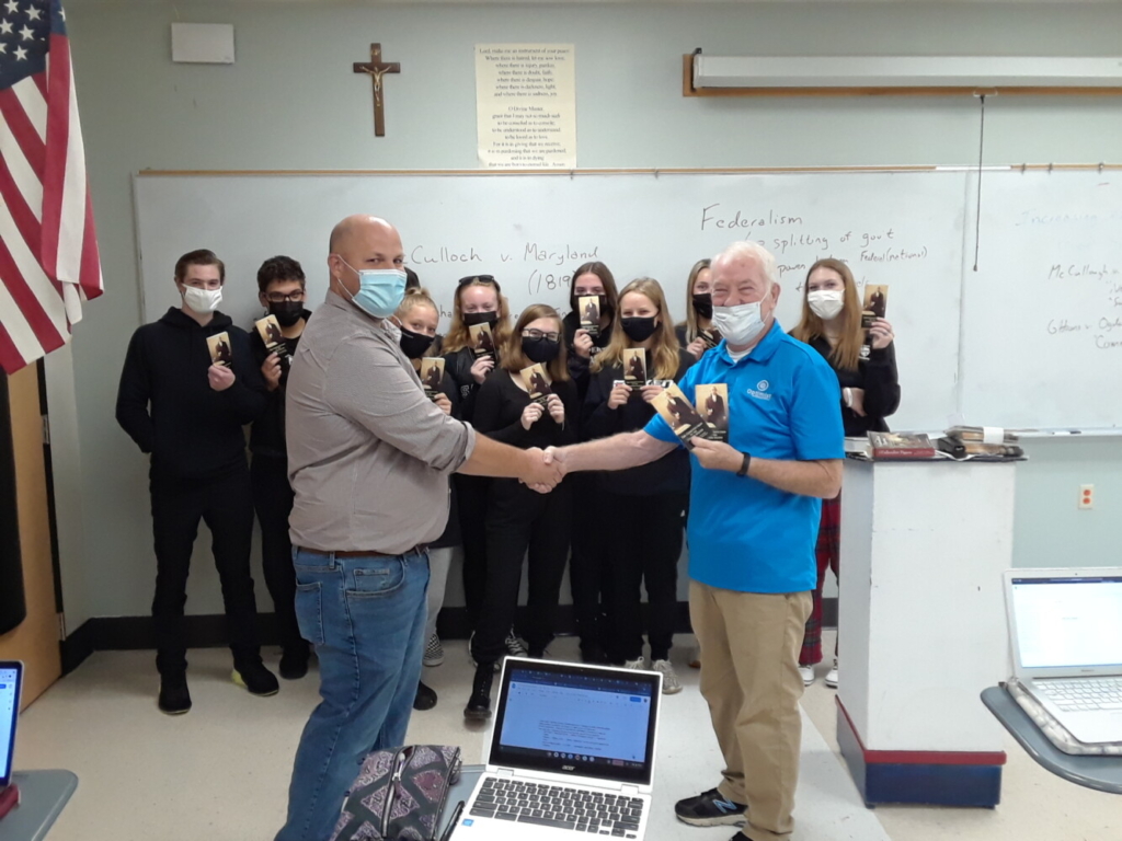 St. Dom’s teacher Stephen Shukie, left, receives a donation of pocket constitutions from Lewiston-Auburn Optimist Club President George Mathews. Students of the St. Dom’s AP U.S. government and politics class are shown in the background holding their pocket constitutions. The Optimist Club has been donating these constitutions to students, parents, schools and other interested organizations over the past decade. Additional pocket constitutions are still available from the Optimist Club by contacting any member or emailing gwmathews91@gmail.com. Contributed photo