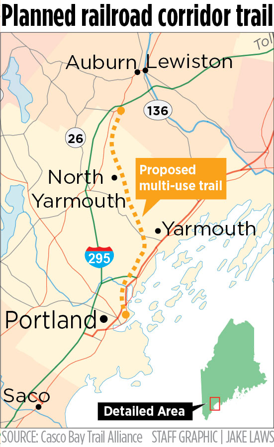 The stretch of track is a key piece in a plan to link a dozen cities and towns along its route as part of a loop-like trail that would connect Portland, Lewiston and Brunswick with a bike pathway eyed by many as boon for tourism in the region.