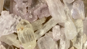 Pieces of kunzite, a variety of the lithium-bearing crystals found in Newry, for sale at the Rock & Art Shop in Bar Harbor. Photo by Kate Cough