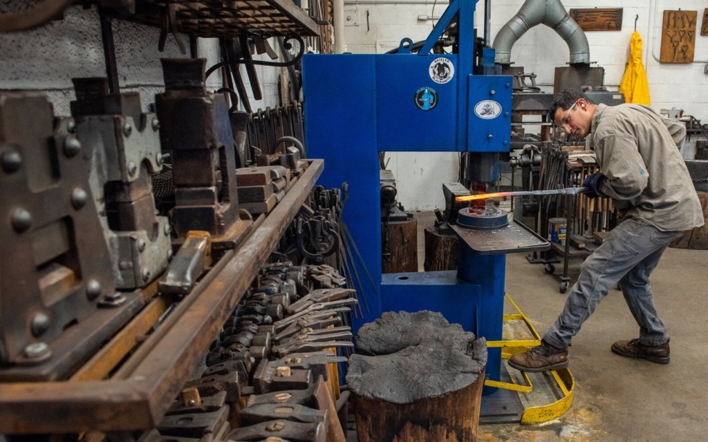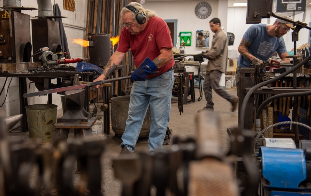 Ben Breda of Hope forges a piece of steel into a Damascus knife on Monday afternoon at New England School of Metalwork in Auburn. He is teaching a six-day class on making 4- to 5-inch hunting knives. A local journeyman bladesmith, Breda got his start making knives at the school in 2012. Russ Dillingham/Sun Journal
