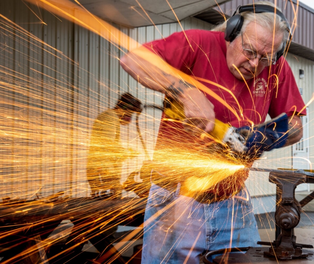 Richard Wright of Troy, New Hampshire, grinds a piece of steel to forge into a Damascus knife on Monday afternoon at New England School of Metalwork in Auburn. He has been taking classes at the school since 2004. Russ Dillingham/Sun Journal
