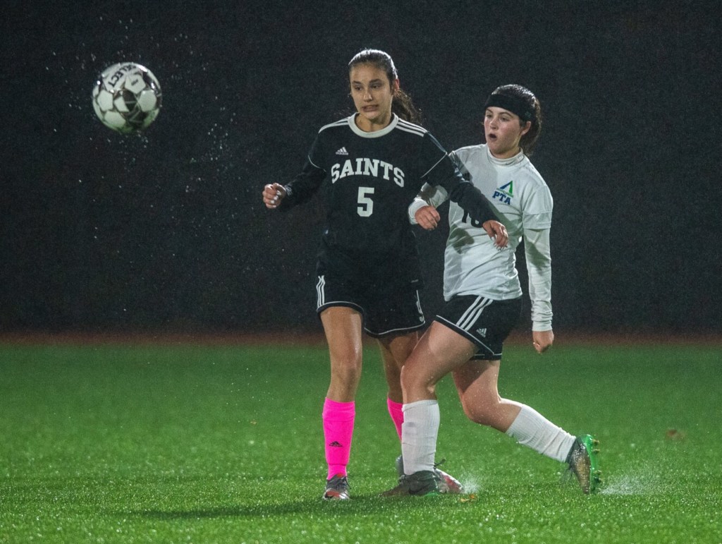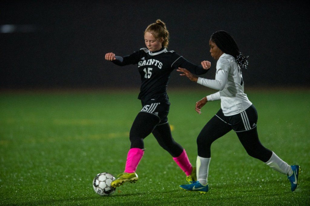 Natalie Brocke reeled off three goals in row as the Saints sailed to a 5-0 victory over ninth-seeded Pine Tree Academy (7-5) in an opening-round Class D South girls soccer playoff game under the lights on Monday night.