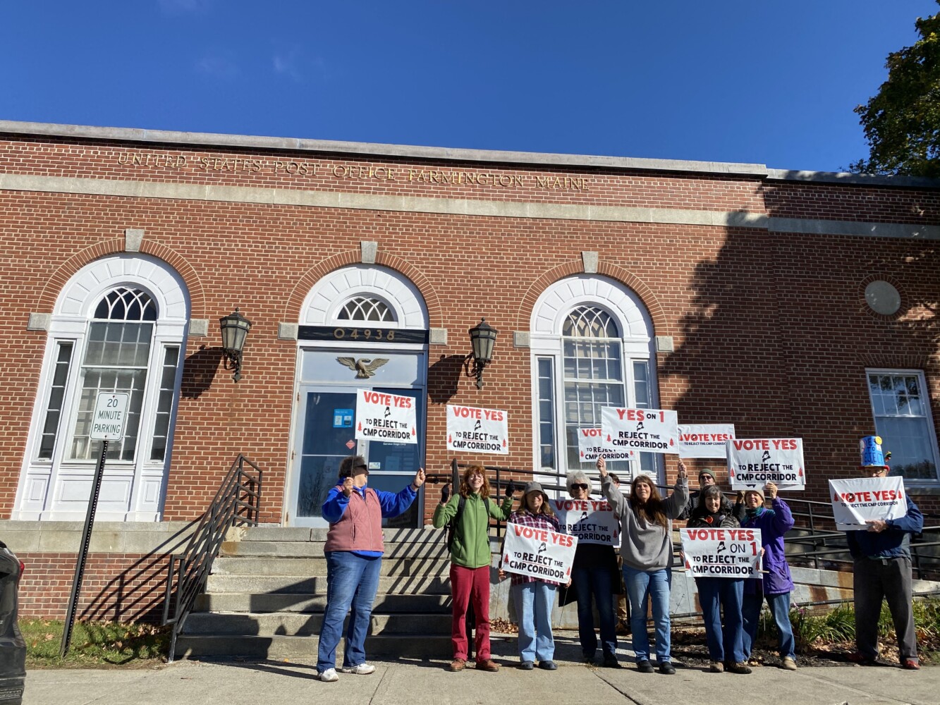 Supporters of Maine’s Referendum Question 1 to reject the CMP corridor gather in front of the Farmington Post Office Thursday, Oct. 28, to educate locals in the final days leading up to the Nov. 2 election. Organizers from Sunrise Movement and Yes on 1 (formerly known as No CMP Corridor) gathered for the latter’s weekly rally, which has been going on since June 2020. Kay Neufeld/Franklin Journal