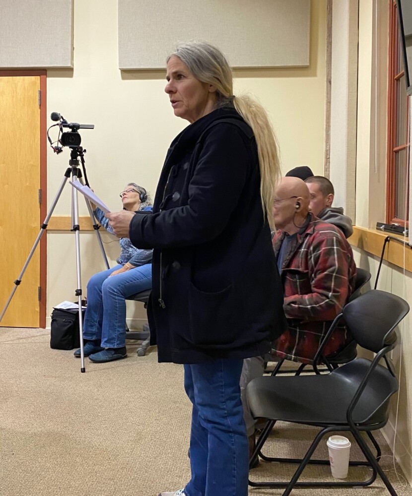 A speaker identified on the School Administrative District 17 board agenda as Lydia Breault reads a statement Monday to directors in Paris likening injections to crimes punishable by death. Nicole Carter/Advertiser Democrat
