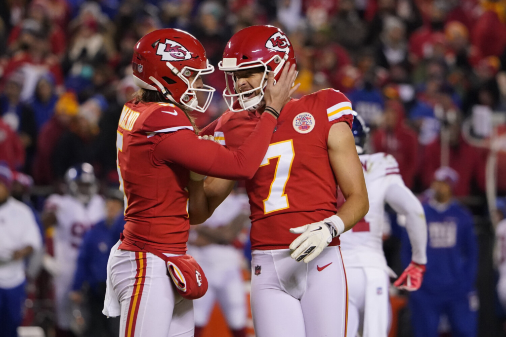 Kansas City kicker Harrison Butker, right, is congratulated by Tommy Townsend after making a 34-yard field goal late in the second half against the New York Giants Monday night. Ed Zurga/Associated Press