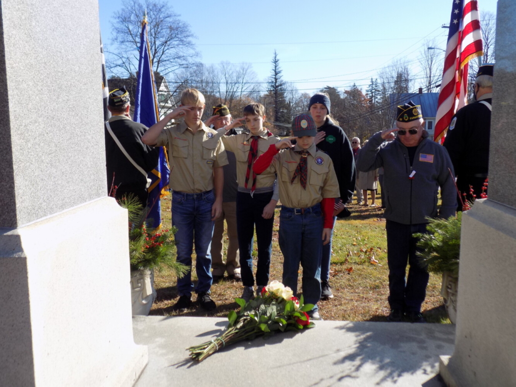 Youth and leaders from local scout troops are seen during a Veterans Day program at Meetinghouse Park in Farmington. Pam Harnden/Livermore Falls Advertiser