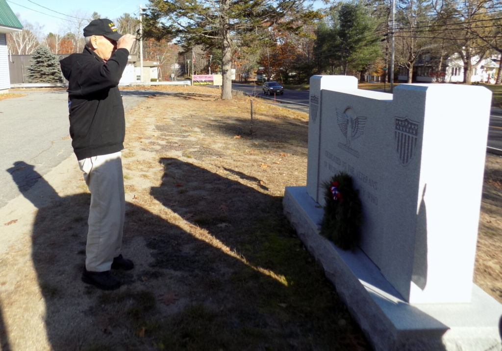 Korean War veteran Harold Beisaw salutes after placing a wreath at the World War II monument Thursday, Nov. 11, during Veterans Day services in Wilton. Pam Harnden/Livermore Falls Advertiser