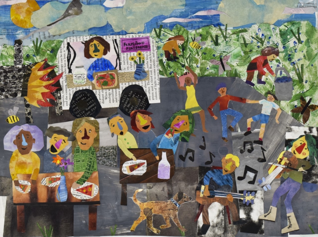 “My response to these questions was to make a piece capturing a community pizza night,” explains Goldberg. “For the past couple of summers we’ve hosted a community wood fired pizza night… We call ourselves Farmstand Flatbreads because we source as many of the pizza toppings as we can from our own gardens, from local farms, or foraged in the woods.