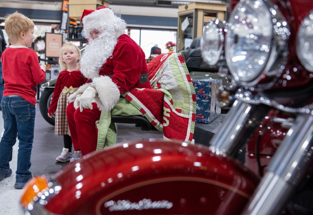 After having photos taken with Santa, families enjoy a pancake breakfast Saturday morning at L-A Harley-Davidson in Lewiston. The motorcycle shop was also collecting nonperishable items for the Good Shepherd Food Bank. Russ Dillingham/Sun Journal