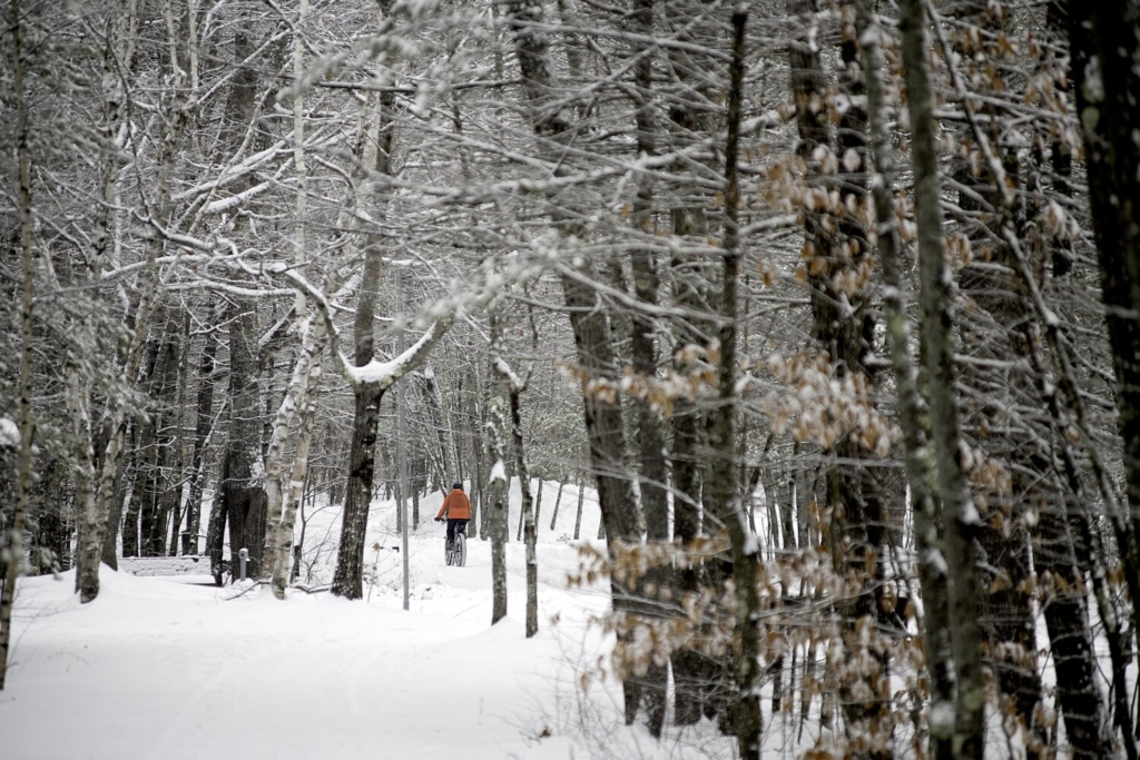 A cyclist rides through the snow Tuesday at Range Pond State Park in Poland. The park is a popular place to ride fat bikes in the winter. Daryn Slover/Sun Journal