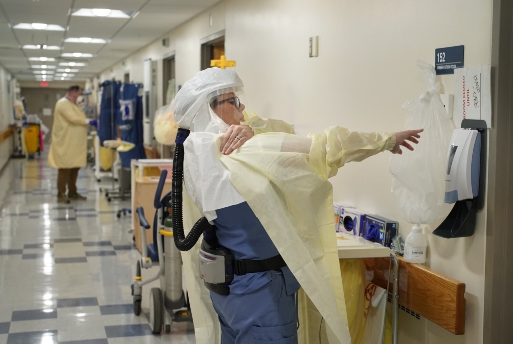 Taylor Bourque, an RN at Stephens Memorial Hospital in Norway, dons PPE while working in the negative pressure COVID-19 wing. Gregory Rec/Portland Press Herald file