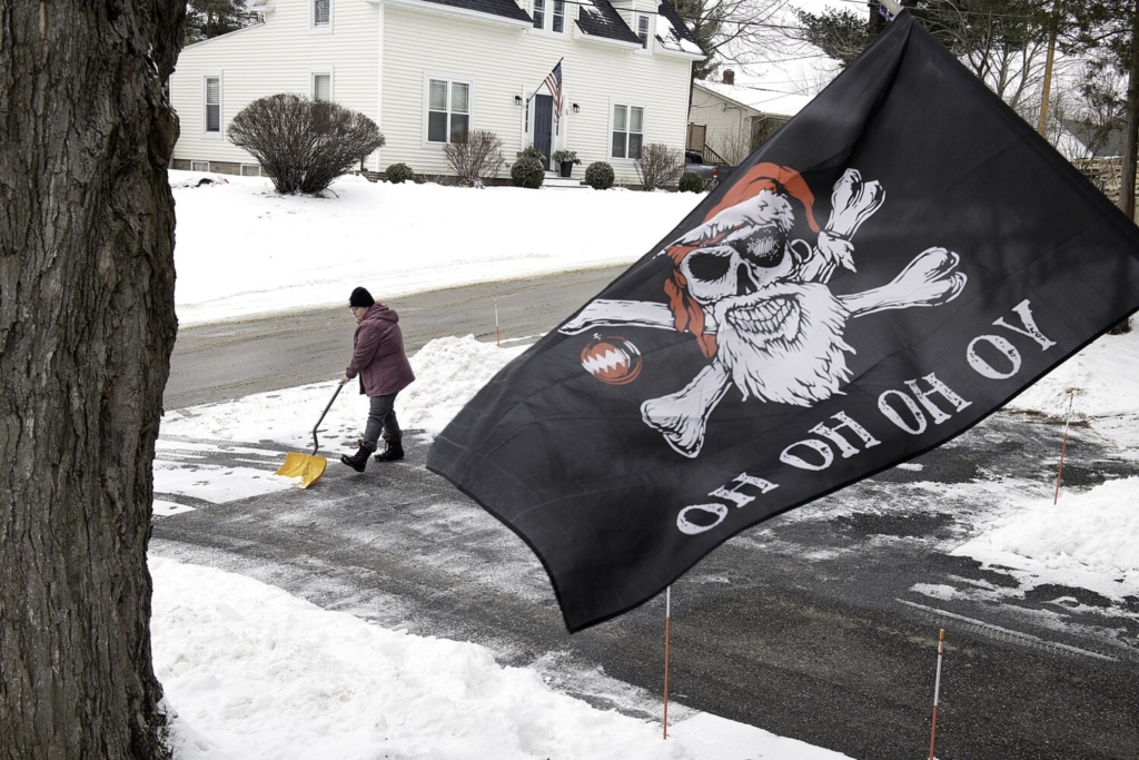 Heather Lewis shovels her driveway Thursday in Lewiston. “I enjoy it,” she said. “We have only broken out the snowblower one time.” As for the pirate flag, Lewis said, “I like different decorations. Not the traditional stuff.” Daryn Slover/Sun Journal