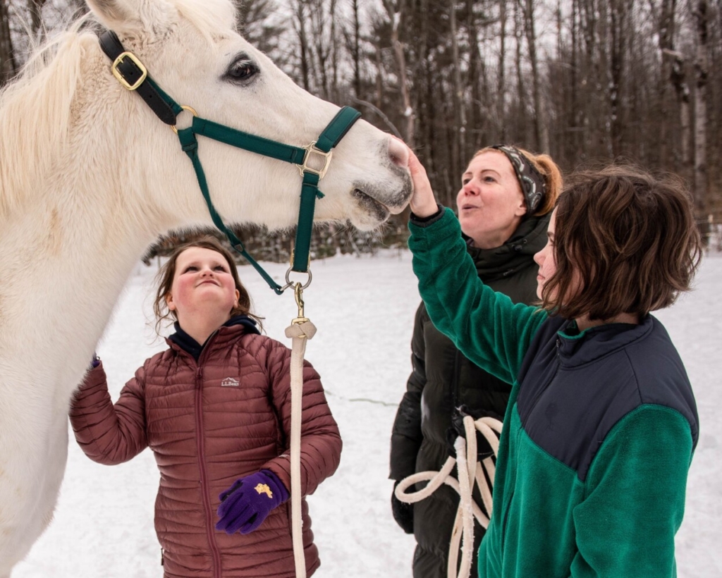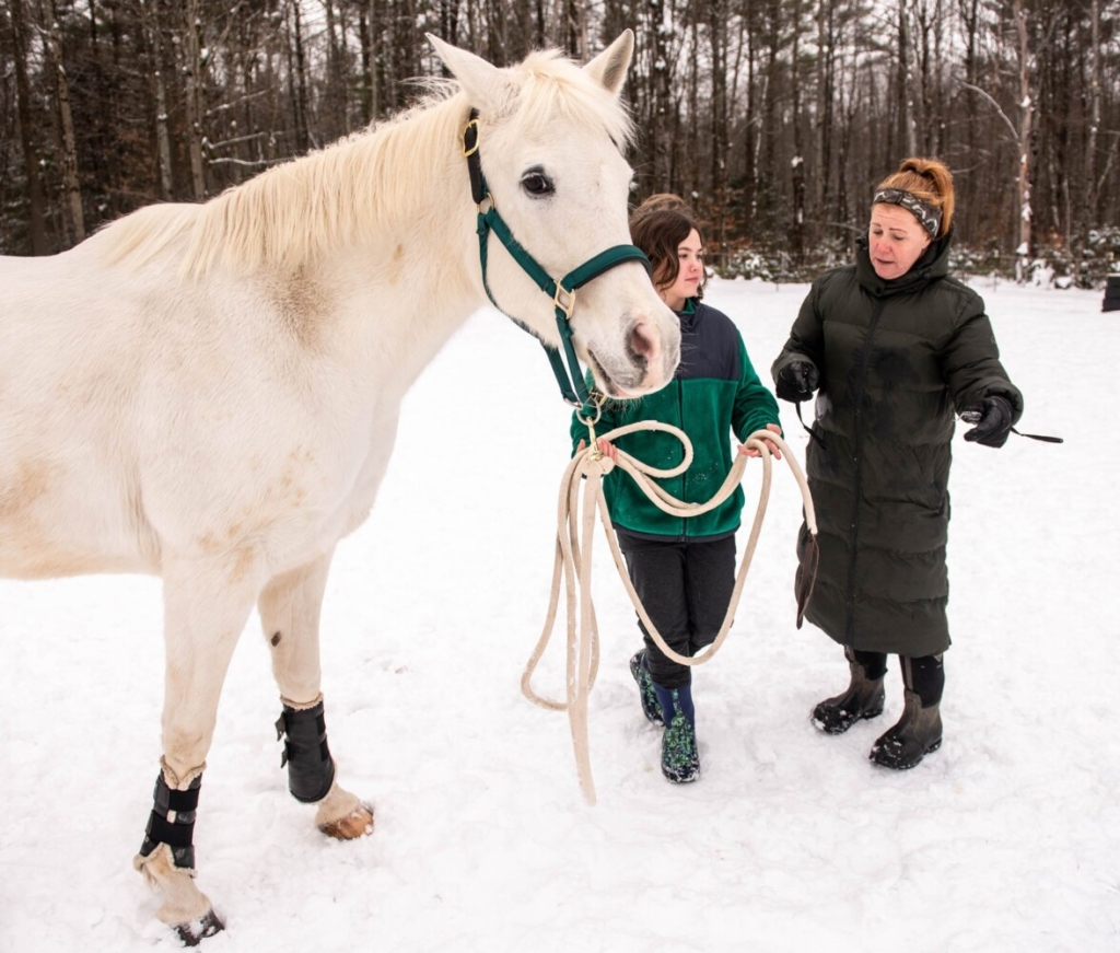 Elodie Malloy, 9, left, Wendy McCann, center, and Madison Lancaster, 10, give some attention to 12-year-old Chance on Thursday at Few Acres Farm in Auburn. The farm’s Christmas Vacation Camp runs during school vacation and teaches children about caring for and riding horses. Andree Kehn/Sun Journal