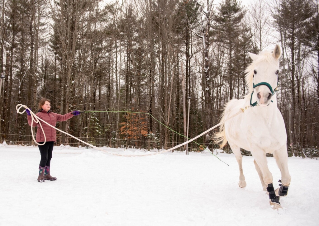 Madison Lancaster, 10, gets tips Thursday from Wendy McCann during a lesson on lunging at Few Acres Farm’s Christmas Vacation Camp. Lancaster has been riding horses since she was 6 years old and said she has enjoyed building a relationship with them. Chance, 12, is a “make me” horse that needs to be told what to do, she said. Andree Kehn/Sun Journal
