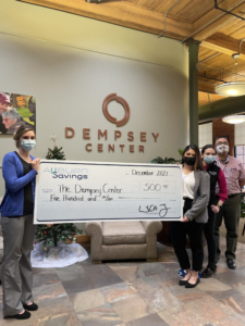Ashley Pennington of Auburn Savings Bank presents the Dempsey Center team in Lewiston with a $500 donation.