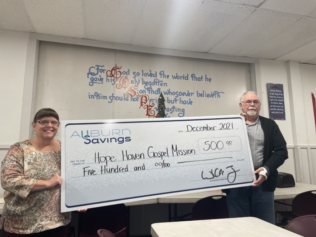 Kim Croteau of Auburn Savings Bank presents Pastor John Robbins at Hope Haven Gospel Mission in Lewiston with a donation of $500.
