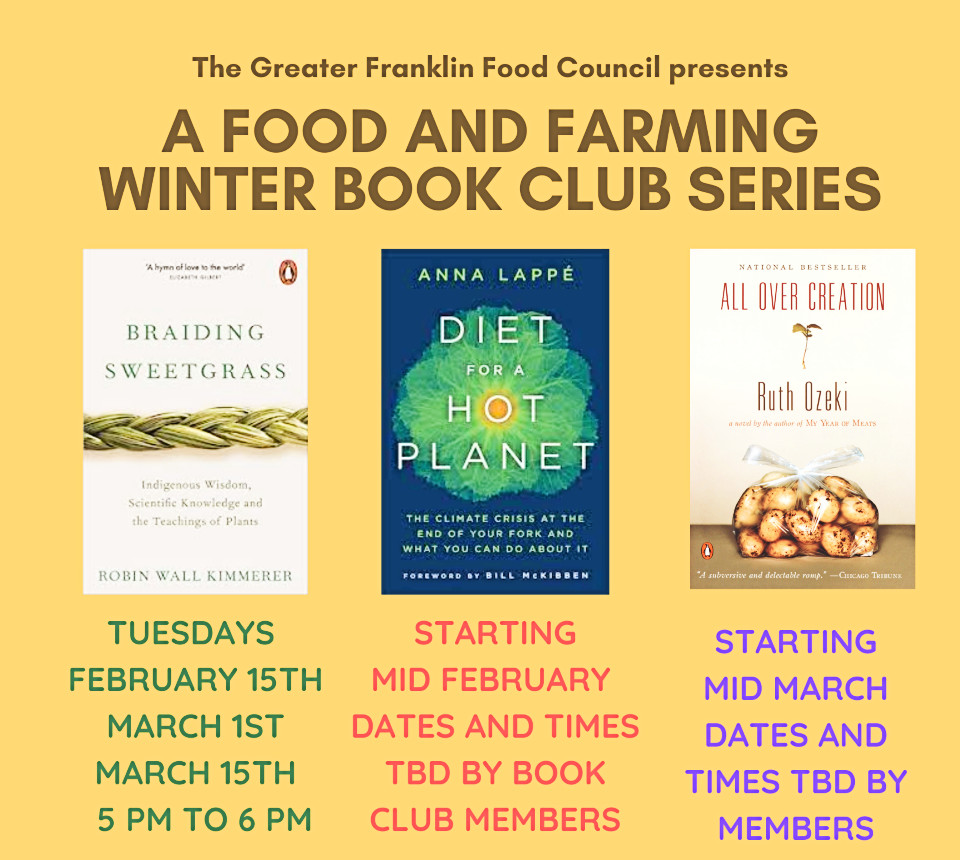 FARMINGTON —The Greater Franklin Food Council will be hosting a Food and Farming Winter Book Club series starting in February. Three book selections will be offered that weave food system issues into other topics such as climate change, Indigenous wisdom, genetically modified plants, sustainable living, and more. Local community members can sign up to read and discuss one, two, or all three book selections being offered.