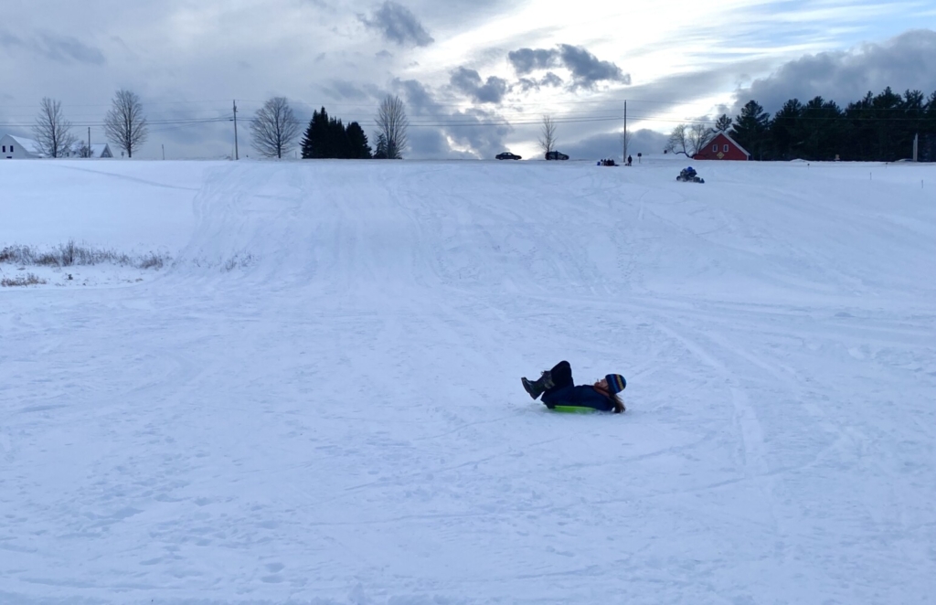 Emma Schurink slides headfirst down Gilmore Hill in Kingfield Sunday, Jan. 23. Gilmore Hill was groomed by the Kingfield Sno-Wanderers Snowmobile Club following the recent storm. Kay Neufeld/Franklin Journal