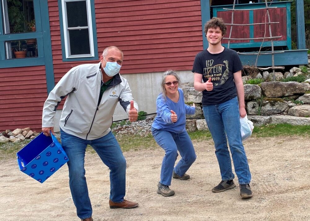 Oxford Hills Comprehensive High School Principal Ted Moccia, left, delivers a graduation cap and gown to senior James Gosnell of Otisfield in 2020. His mother, Kristin Roy, stands with him. When the pandemic closed schools in 2020, Moccia personally delivered caps and gowns to each graduate. Supplied photo