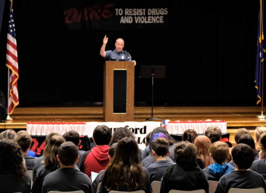 The 34th DARE event, sponsored by the Rumford Police Department, was held for the 56 sixth graders completing the 16 week-program. It took place on May 13 in the lecture room at the Mountain Valley Middle School. Due to the pandemic, the public could not attend, but it was shown live on Facebook.