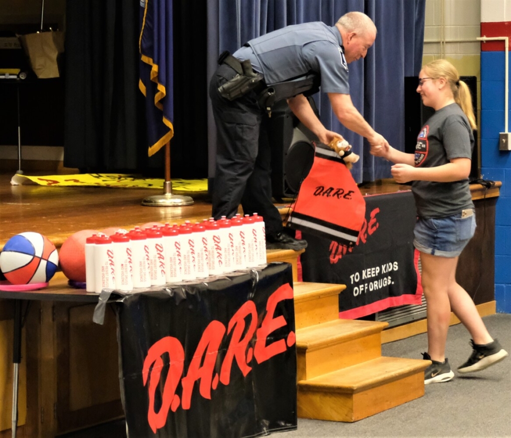 DARE Instructor Doug Maifeld presents DARE gifts to Emily Gilbert for being one of the self-esteem license plate message winners during the DARE culmination celebration on May 13. Bruce Farrin/Rumford Falls Times