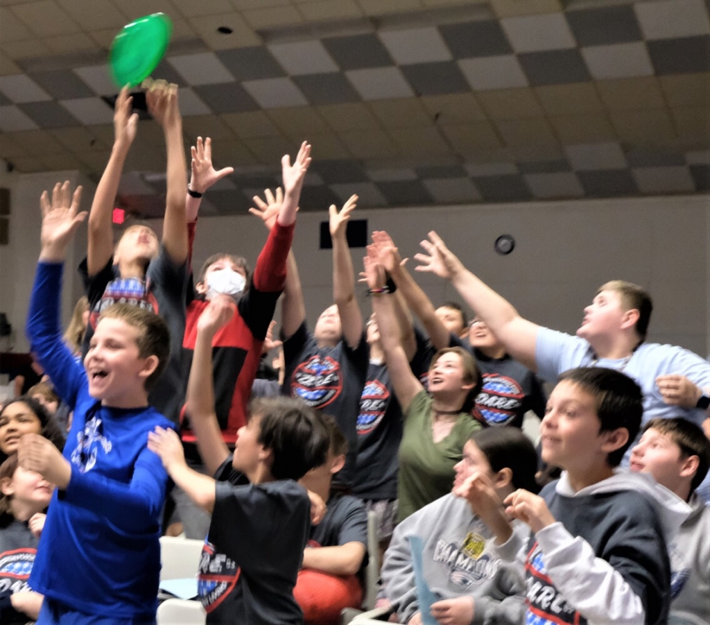 Fifth graders reach out for one of the flying DARE frisbees during the DARE culmination celebration on May 13. Bruce Farrin/Rumford Falls Times