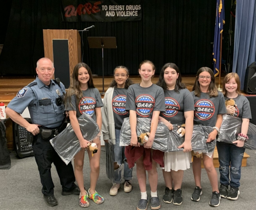 DARE Instructor Doug Maifeld poses for a photo with the six students who read their taking a stand winning essays during the DARE culmination celebration on May 13. Those winners, not in any order, were Madilynn Sirois, Nyala Flores, Felicita Colon, Bronwynn Crownover, Addison Libby and Hanley Fitzsimmons. Submitted photo