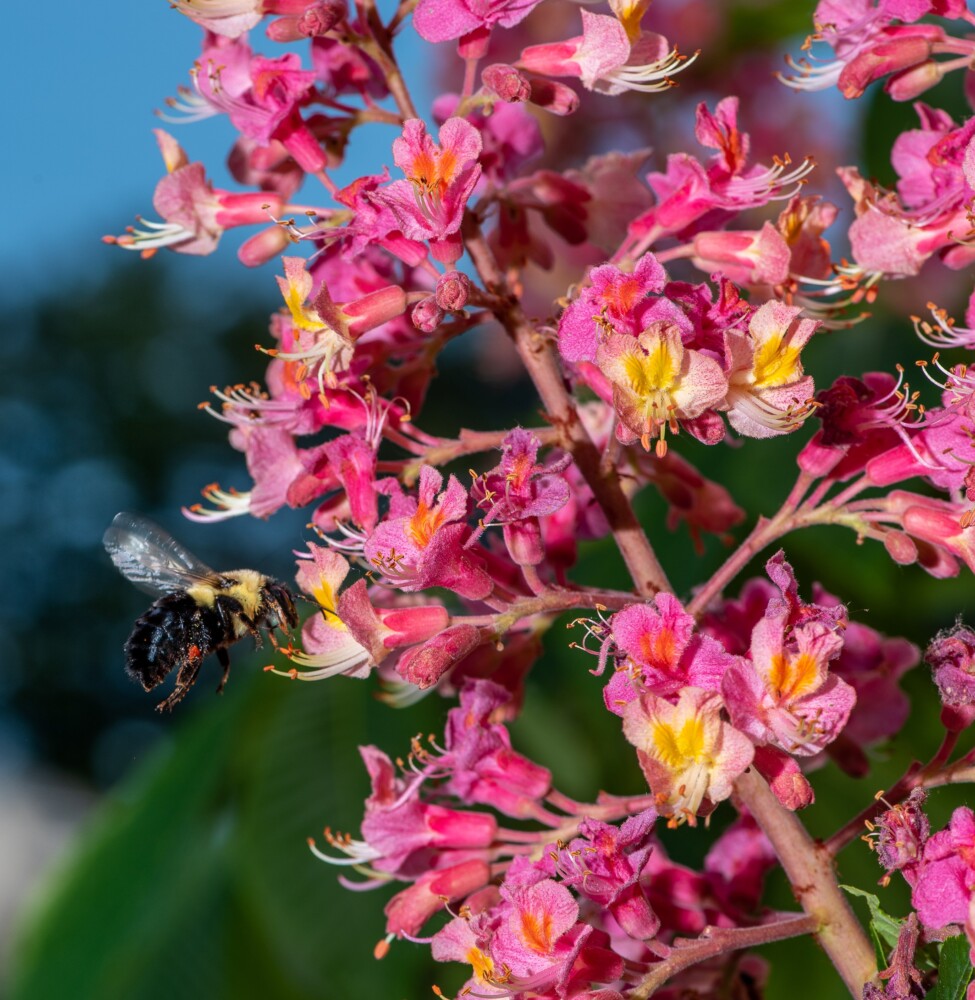 A carpenter bee feeds Wednesday afternoon from a pink horse-chestnut tree at Pettingill School Park on College Street in Lewiston. Russ Dillingham/Sun Journal