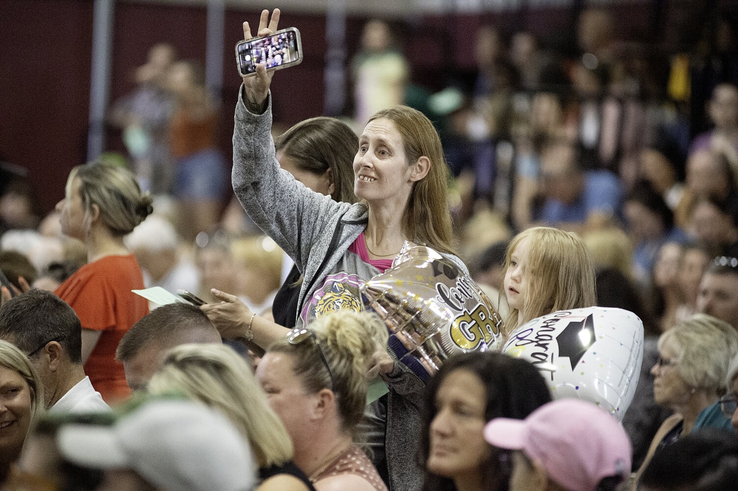 Pam Swan waves to her son, Austin Wing, during the eighth-grade celebration Wednesday at Auburn Middle School. Daryn Slover/Sun Journal