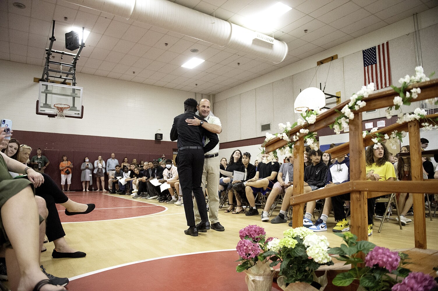 Edward Little High School Principal Scott Annear gives Adolphe Ngengele a pat on the back after Ngengele crossed the bridge from eighth grade to ninth grade during the eighth-grade celebration Wednesday at Auburn Middle School. Ngengele is now a freshman at EL. Daryn Slover/Sun Journal