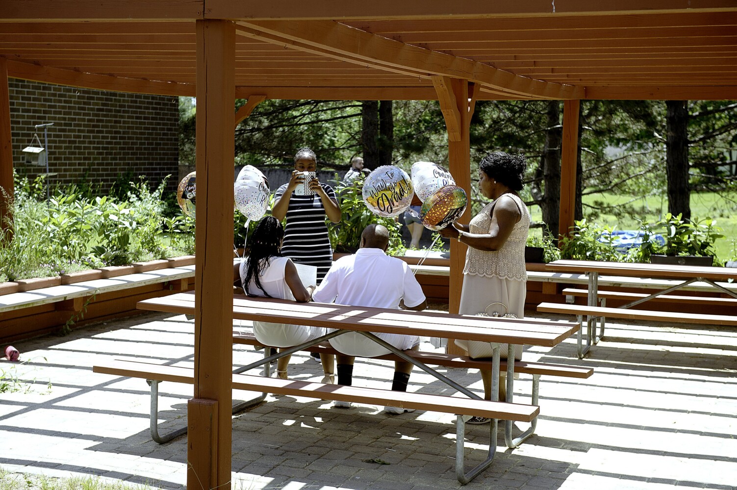 Princess Monday takes a picture of her sister, Favour, brother, Bari and mother, Catherine, following the eighth-grade celebration Wednesday at Auburn Middle School. Favour and Bari graduated from AMS and are now freshman at Edward Little High School, the school that Princess graduated from June 5. Daryn Slover/Sun Journal