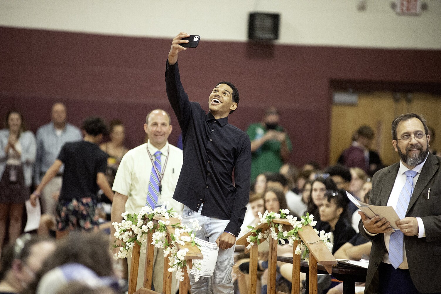 Gustavo Santos takes a selfie Wednesday on the bridge to ninth grade at Auburn Middle School. Santos is one of 235 students who graduated from AMS and are now high school freshman. Family of students were invited to attend the celebration. Daryn Slover/Sun Journal