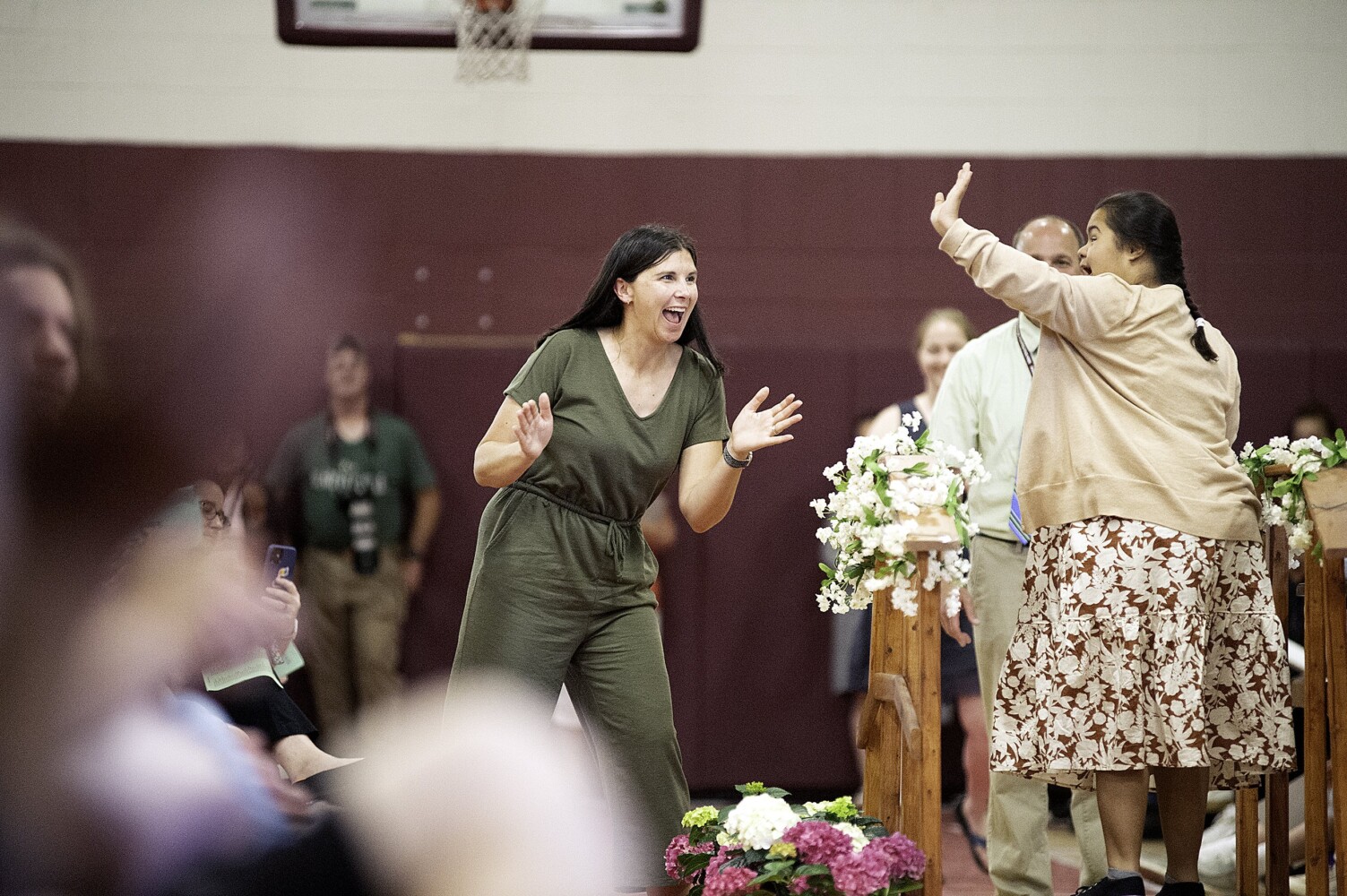 Kylee Lebrun receives a fist bump explosion from Bim Gibson on Wednesday during the eighth-grade celebration at Auburn Middle School. Daryn Slover/Sun Journal