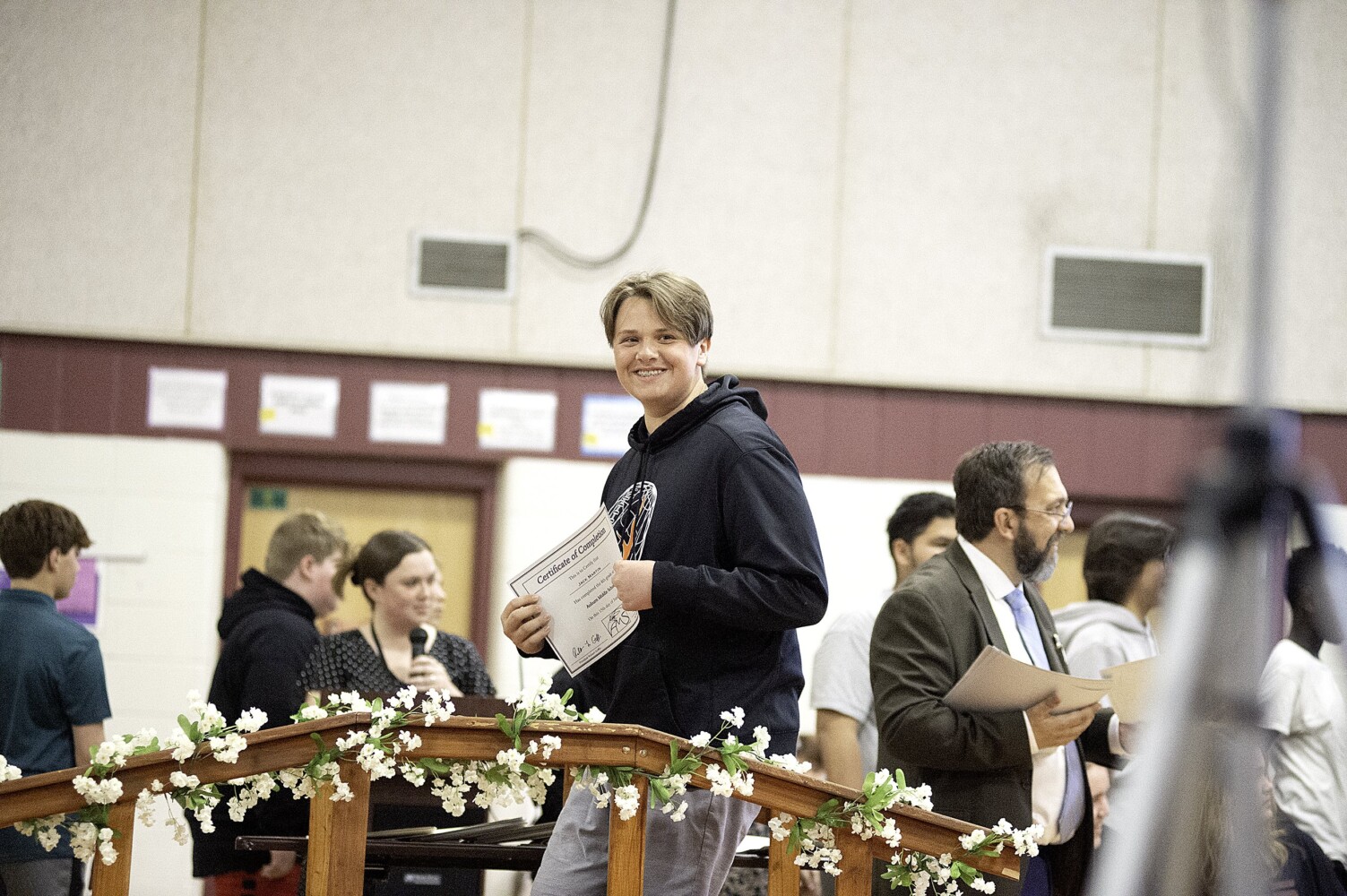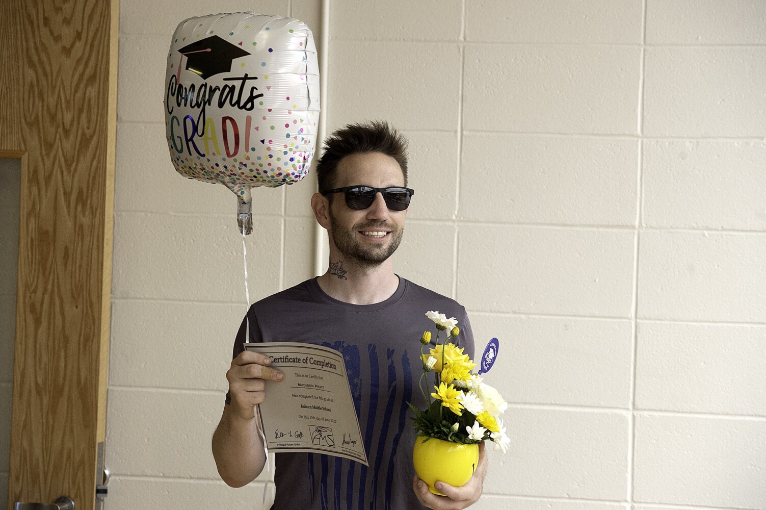 Jack Martin proudly shows his certificate of completion Wednesday during the eighth-grade celebration at Auburn Middle School. Daryn Slover/Sun Journal