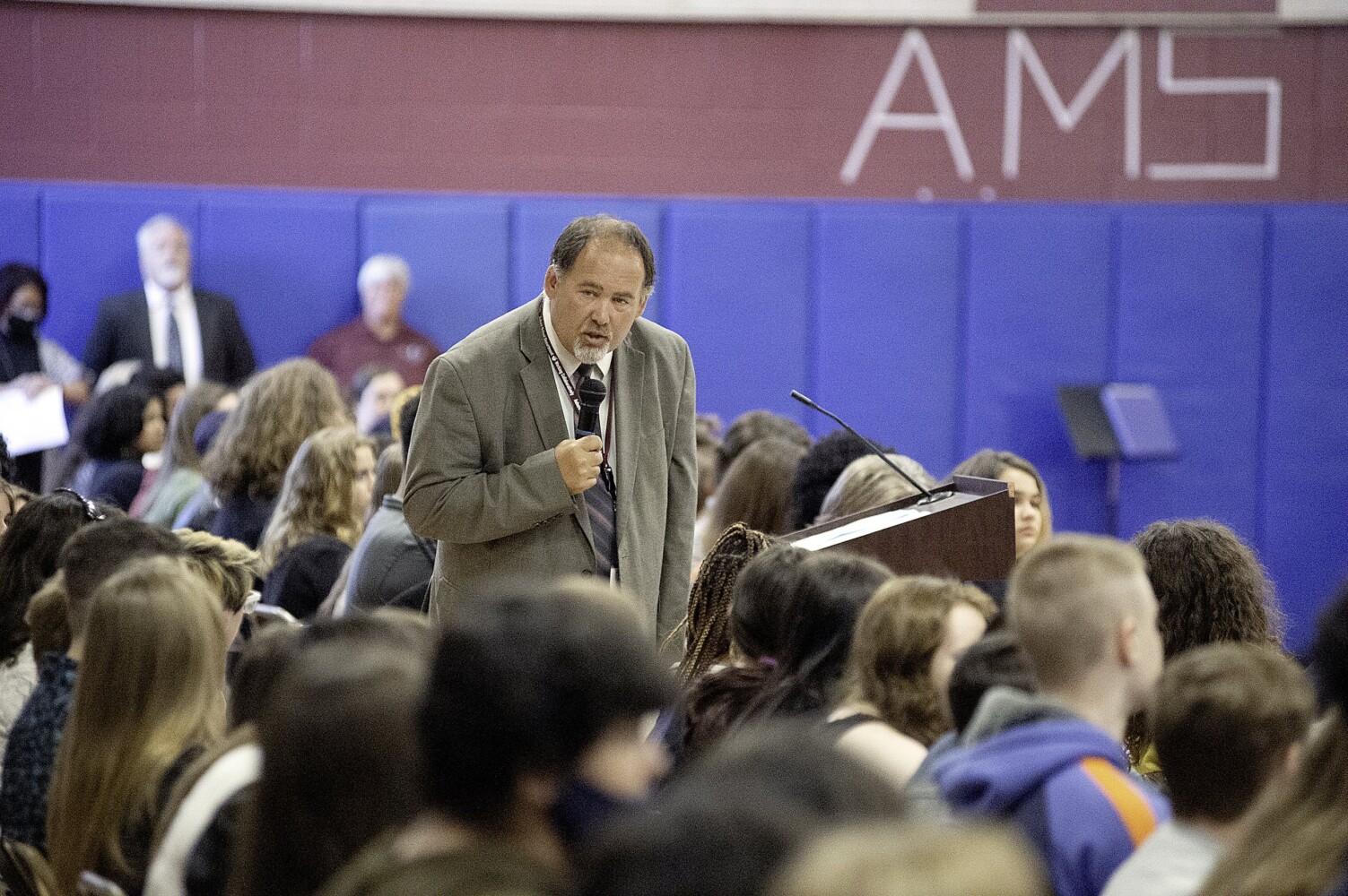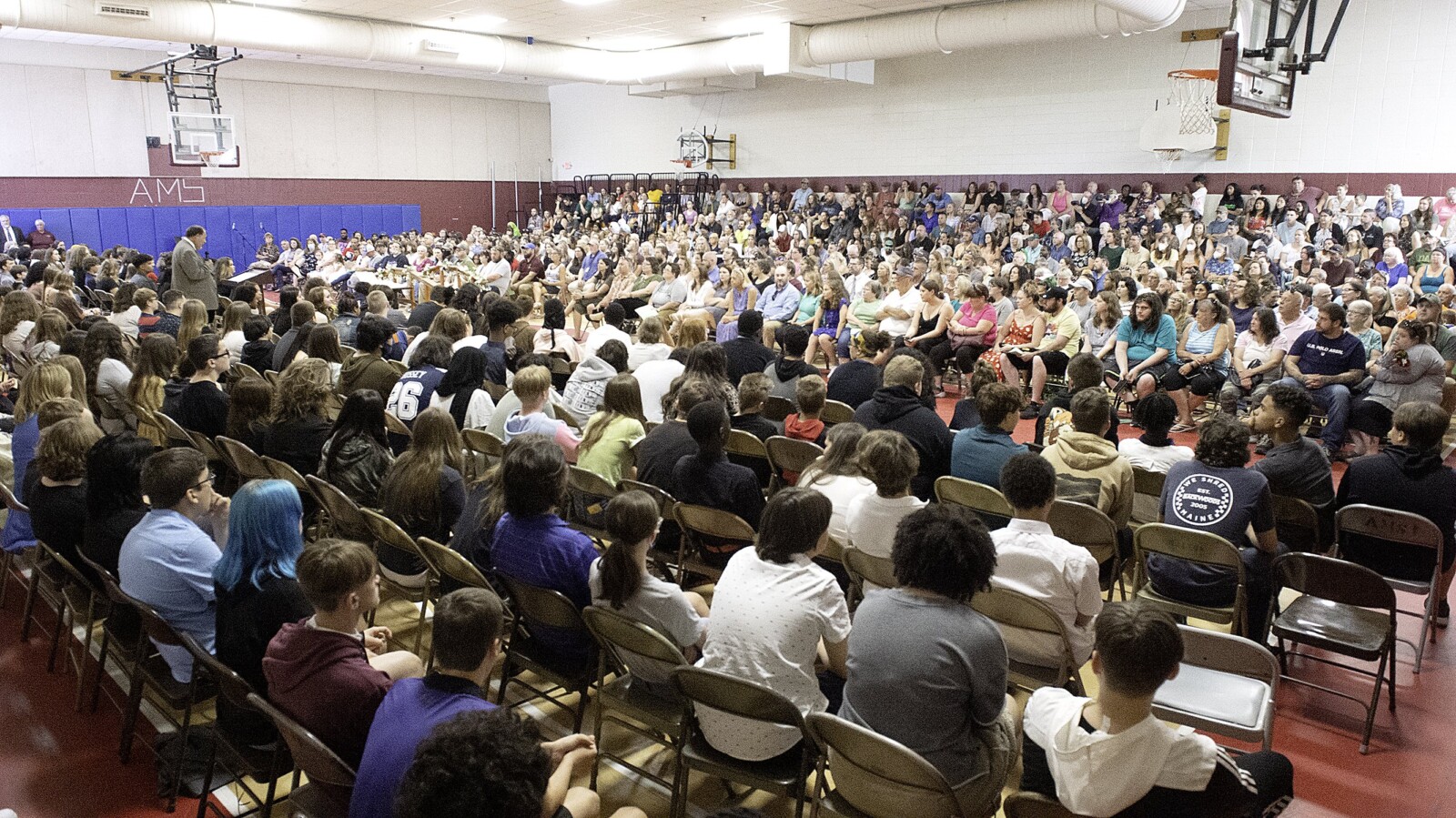 Eighth-grade students and members of their family listen Wednesday to Principal Bob Griffin during the eighth-grade celebration at Auburn Middle School. Daryn Slover/Sun Journal