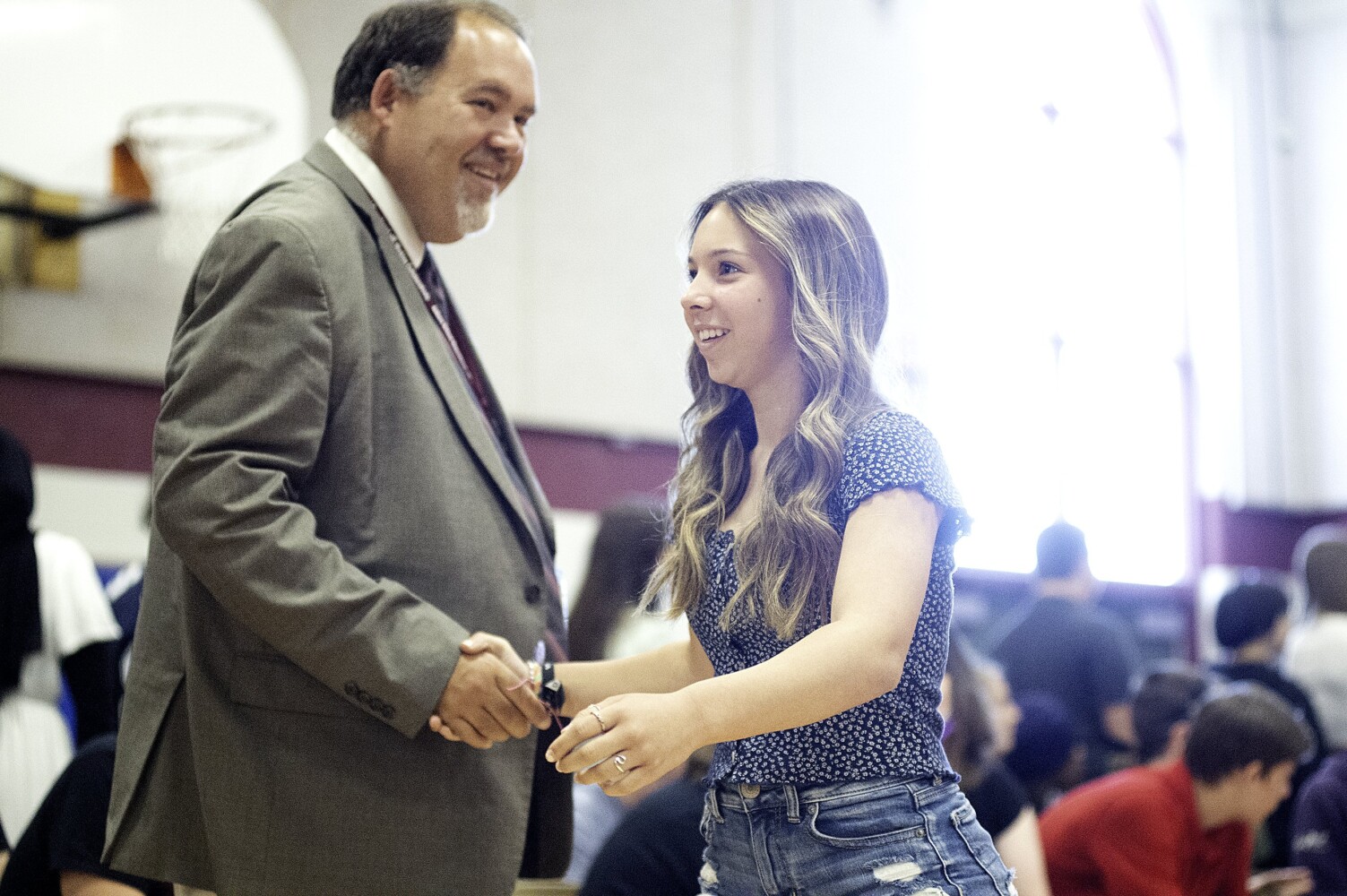 Sophie Cote shakes hands Wednesday with Principal Bob Griffin during the eighth-grade celebration at Auburn Middle School. Cote is one of 235 students who graduated from AMS and are now high school freshman. Daryn Slover/Sun Journal