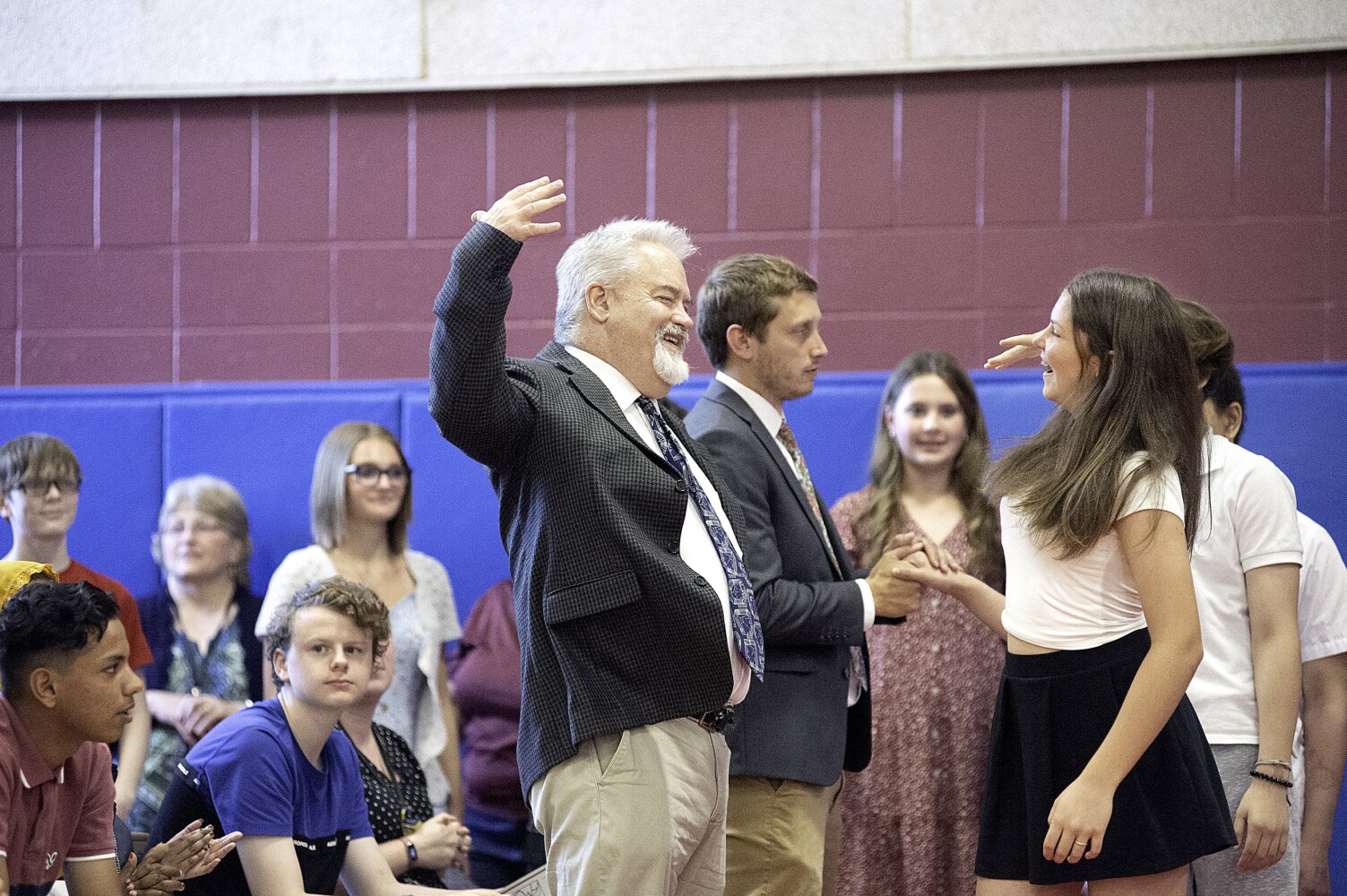 Principal Bob Griffin wishes his eighth graders well Wednesday during their celebration at Auburn Middle School. Griffin’s last day with AMS students will be Thursday, the last day of school. Ben Wilson will be the new principal at AMS beginning July 1. Daryn Slover/Sun Journal