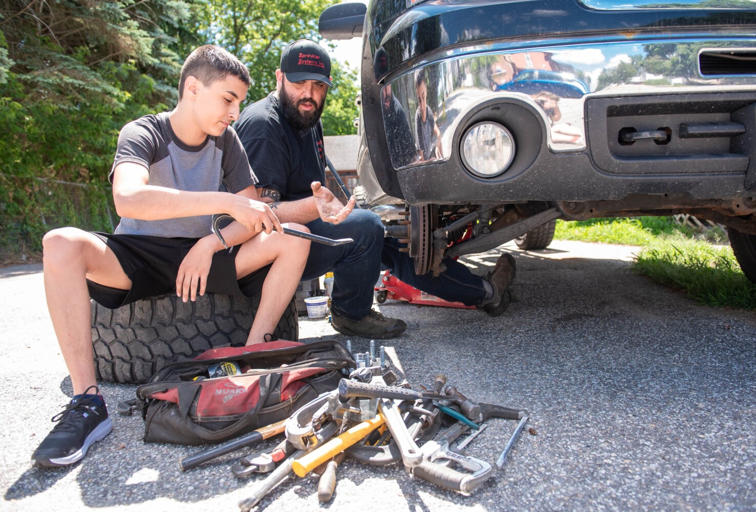 Gavin Coolidge, 15, passes a crowbar to his father, Matt, on Friday in Auburn as the two work on the drivetrain of Matt’s pickup truck. Coolidge has been helping his dad work on his vehicle for as long as he can remember and has been eager to start automotive classes in high school. Andree Kehn/Sun Journal