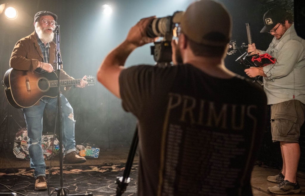 Toby McAllister of Mechanic Falls performs his song “Coast to Coast” on Wednesday evening for a video directed, photographed and recorded by Eli Allen, center, and his brother, Jed Allen, in the 1800 Club on Court Street in Auburn. The song is about McAllister’s earlier years touring. Andree Kehn/Sun Journal